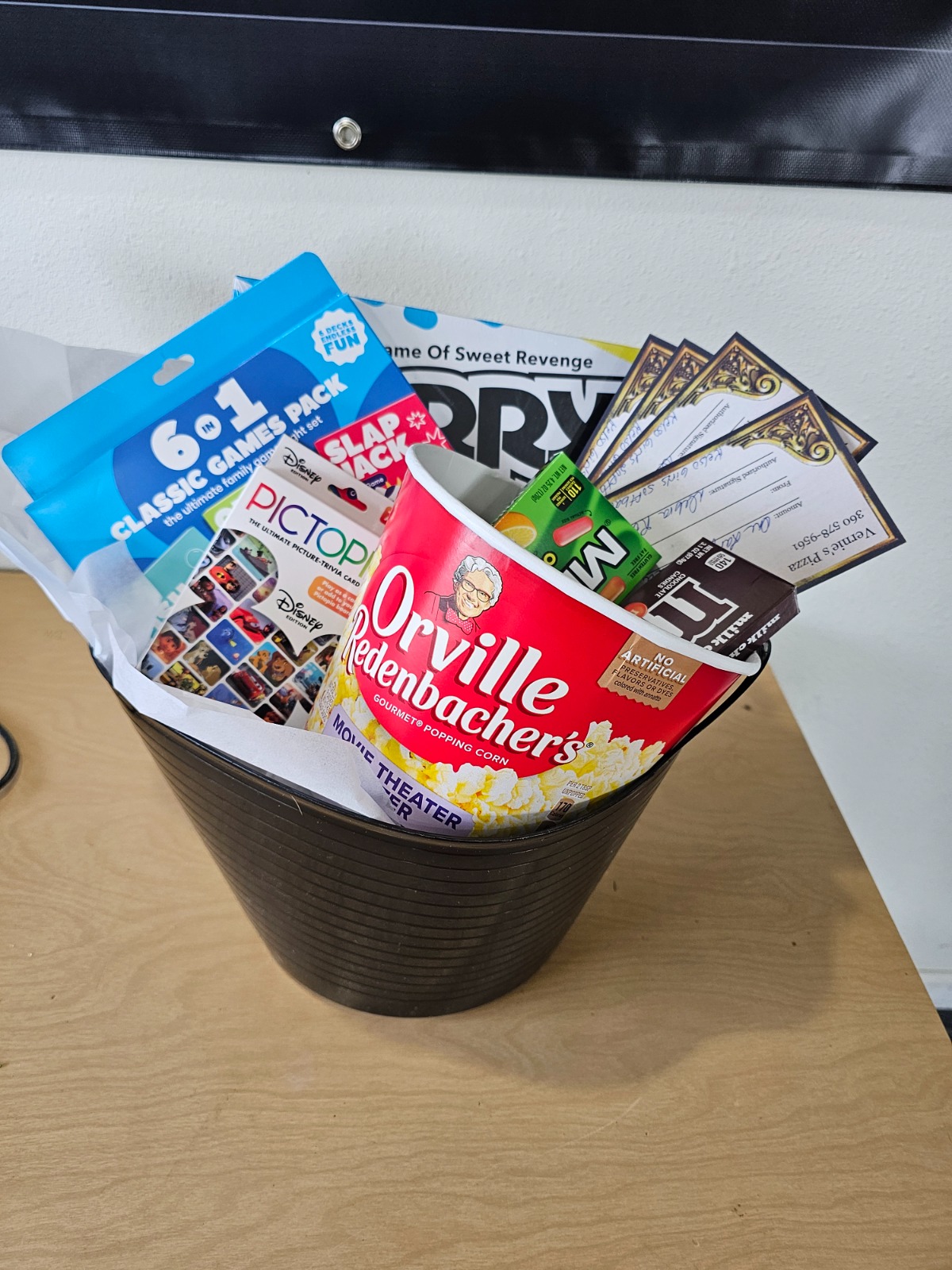 #1 FAMILY GAME NIGHT - Sorry Board game, Disney Pictopia card game, 6-pack card game set (Go Fish, War, etc), Movie Theatre popcorn, M&M's, Mike & Ikes, 4 Vernies Pizza gift certificates (Total Value $150.00)