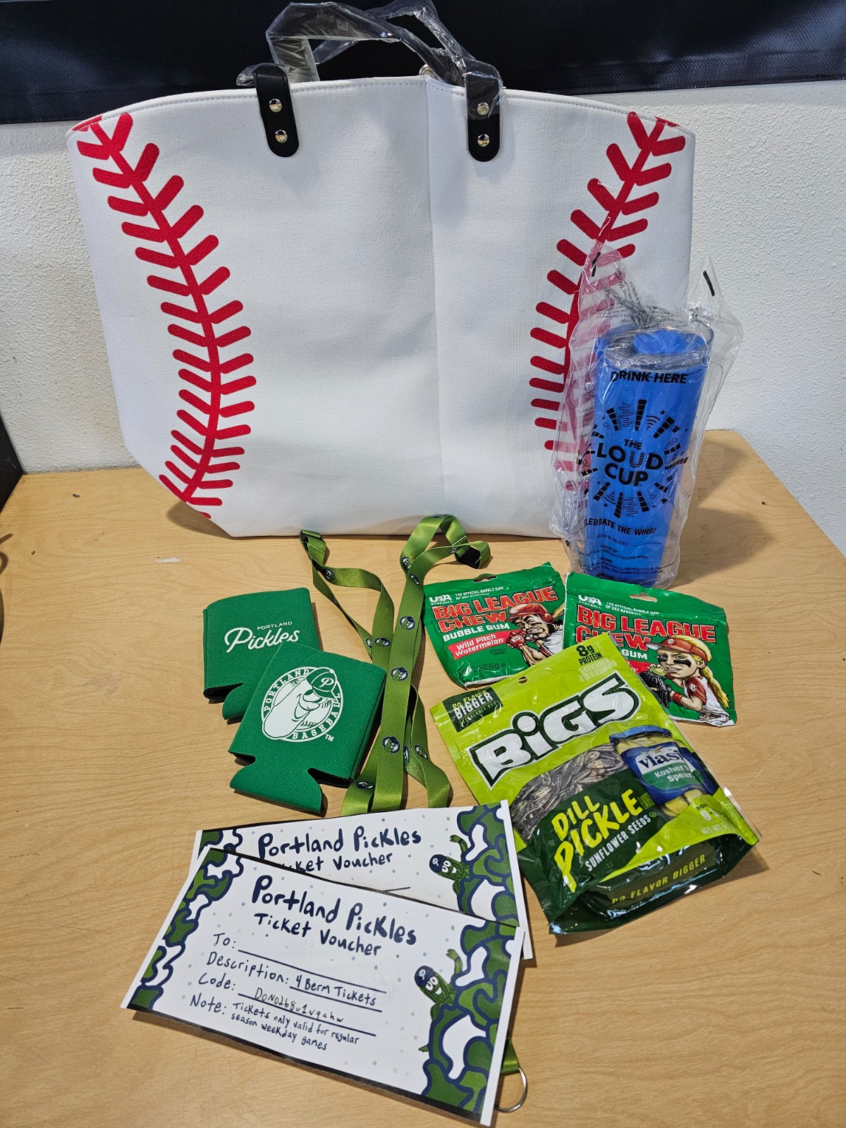 #2 PICKLES BASEBALL FAN FARE: Portland Pickles Baseball 2-4 person berm game tickets ($60.00), Baseball tote bag, The Loud Cup, Dill Pickle Sunflower seeds, big league chew. (Total value $110.00)