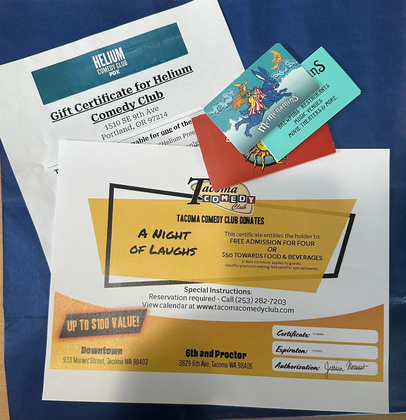 #3 NIGHT OF LAUGHS: Helium Comedy Club admission for 6, Tacoma Comedy Club admission for 4, McMenamins $50.00 gift card (Value $300.00)