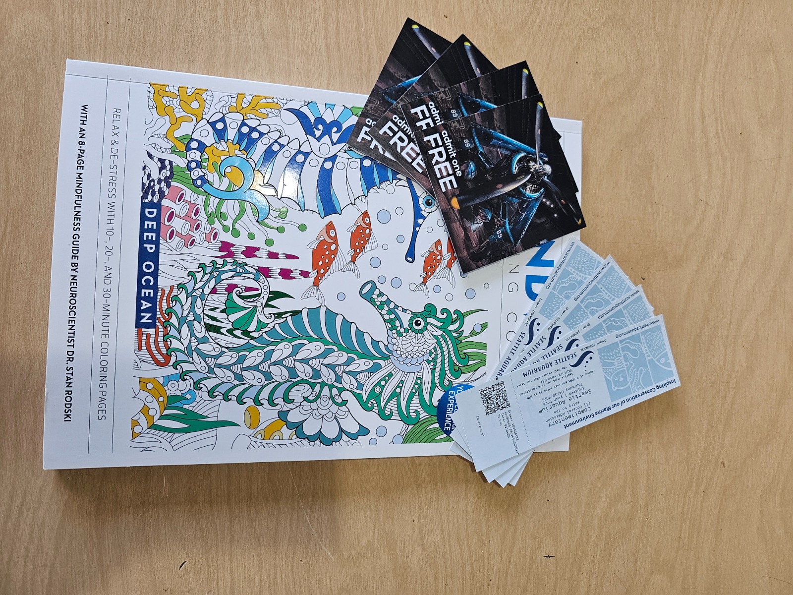 #5 CURIOSITY IN MOTION - Seattle Aquarium 4 guest passes ($139.80), Museum of Flight 4 guest passes ($100.00) Making Waves coloring book (Total value $250.00)