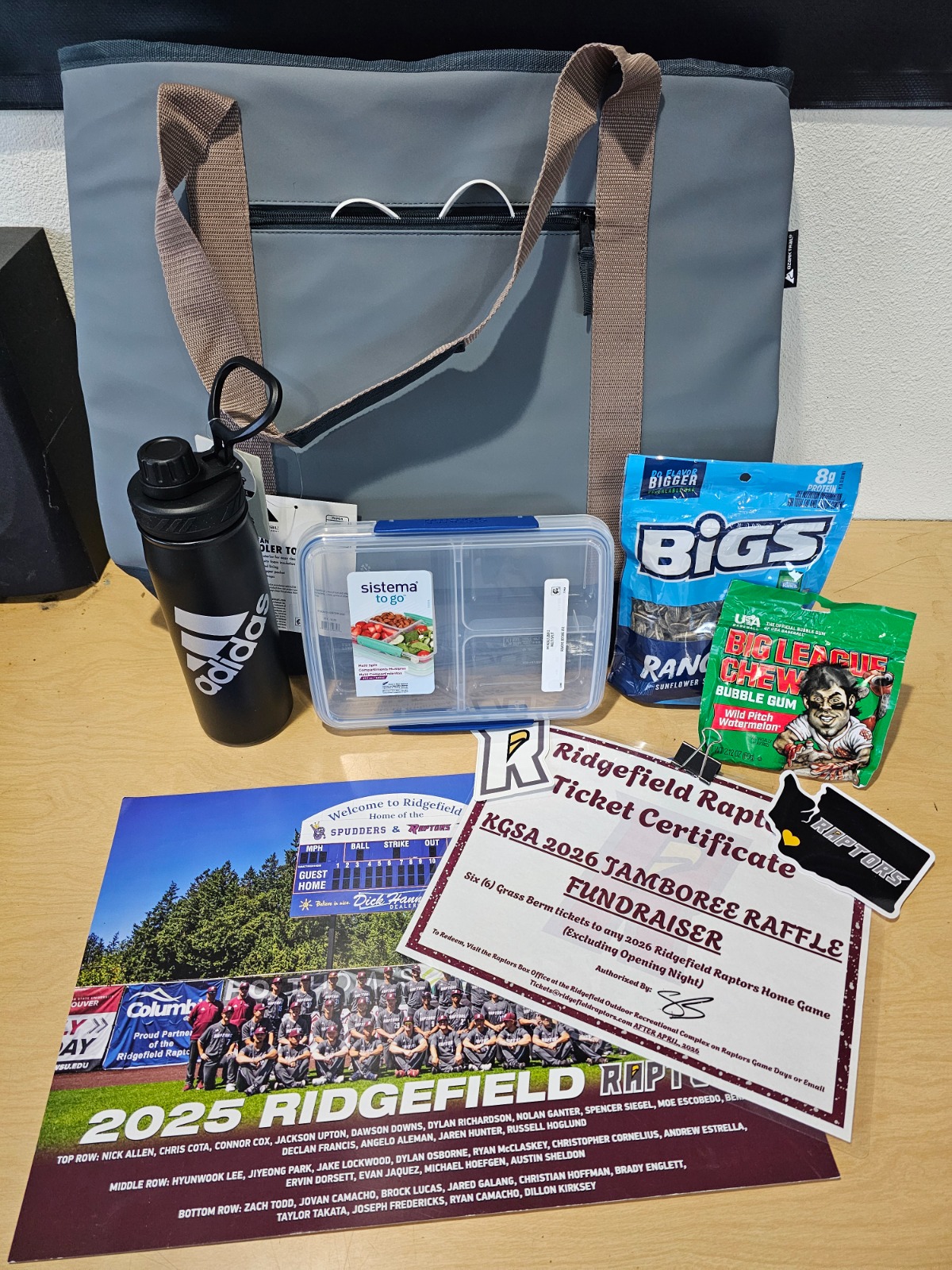 #6 EXPERIENCE THE RAPTORS - Ridgefield Raptors Baseball tickets for 6 in grass berm ($90.00), Signed team poster, Snacklebox, Cooler tote bag, Sunflower seeds, Big league chew, Water bottle (Total Value $115.00)