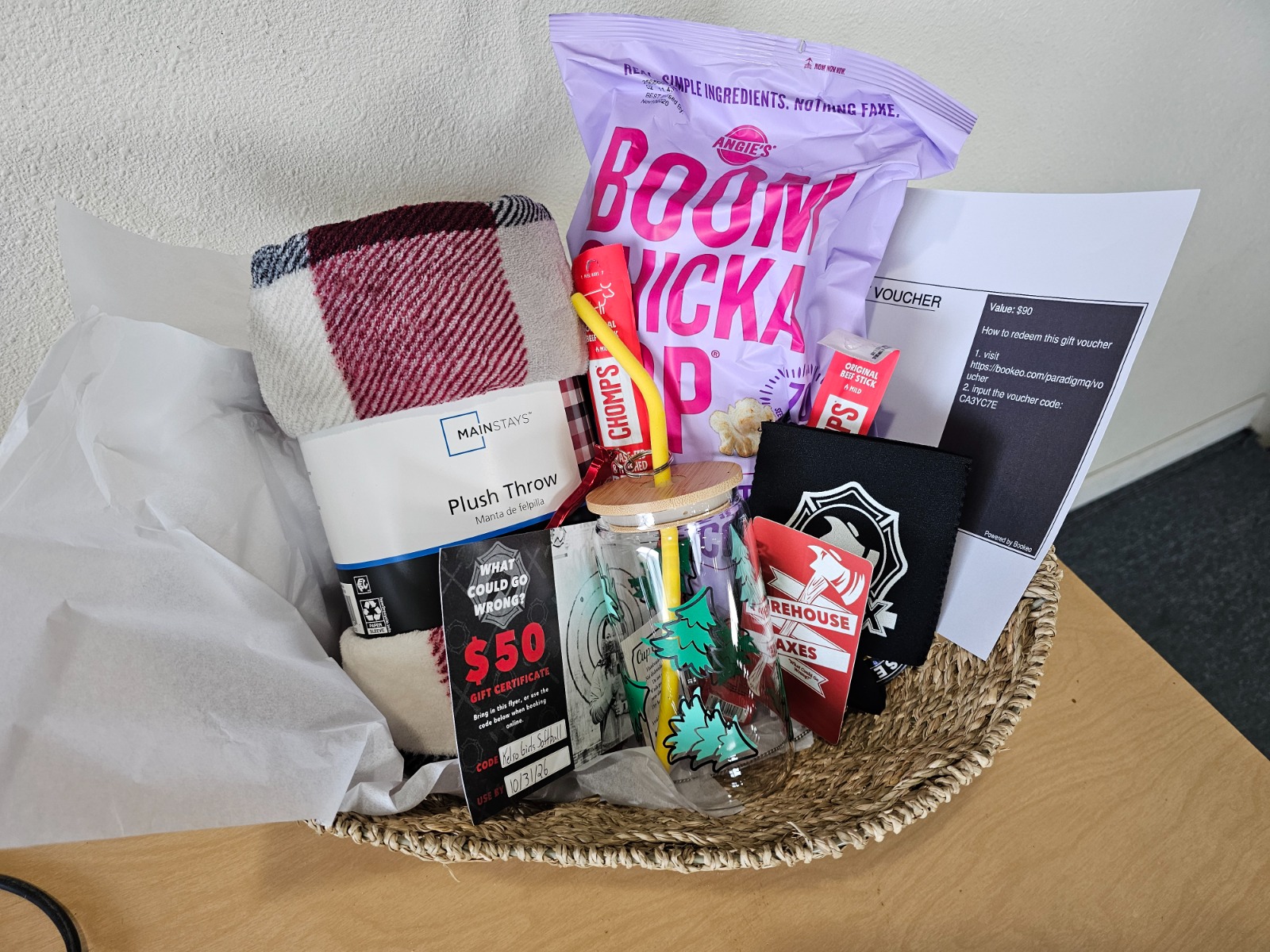 #7 AN AXE-CITING ESCAPE NIGHT - Firehouse Axes Gift Certificate ($70), Paradigm Escape Room gift certificate for 2 ($90.00), Boom Chicka Pop Kettle Corn, Plaid Fleece Blanket, 2 Chomps beef sticks, Glass tree tumbler (Total Value $178.00)