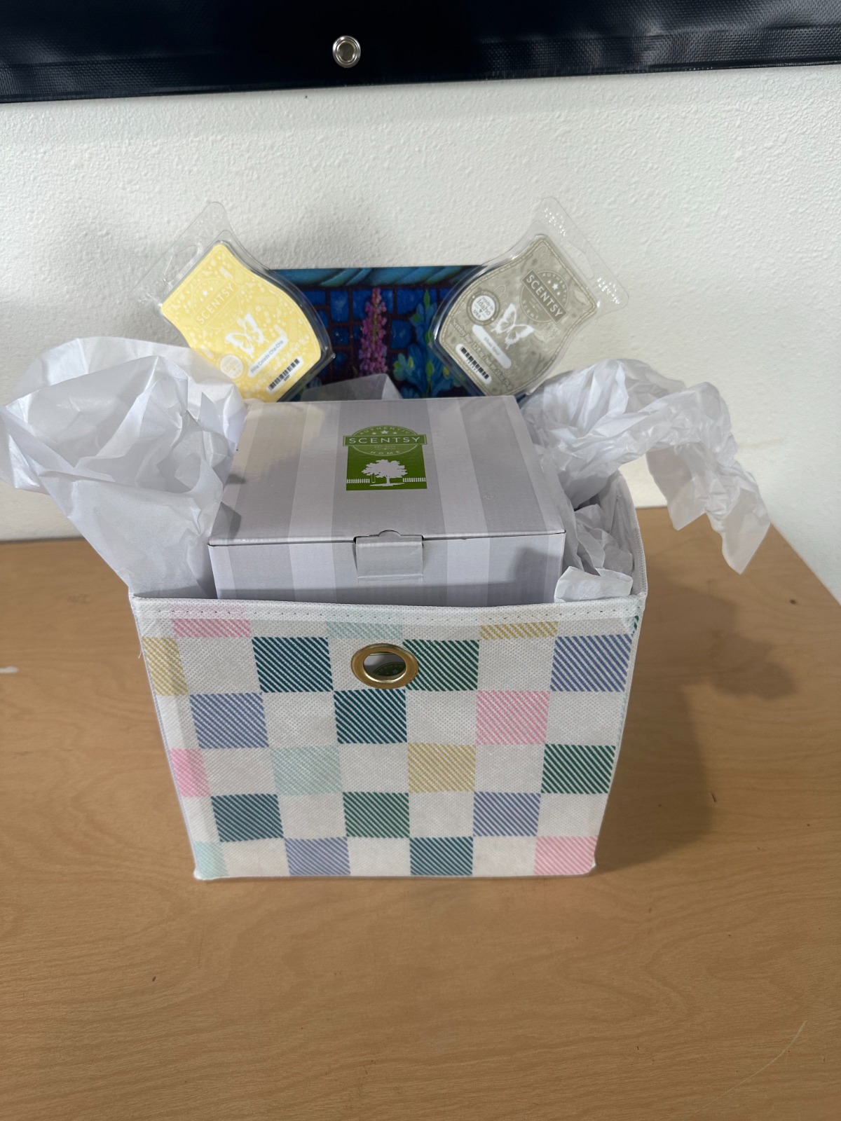 #8 HOME SCENTS - Mountain Scene Scentsy Warmer ($55.00), 2 Scentsy scent bars, Glass Iris cutting board (Total value $75.00)