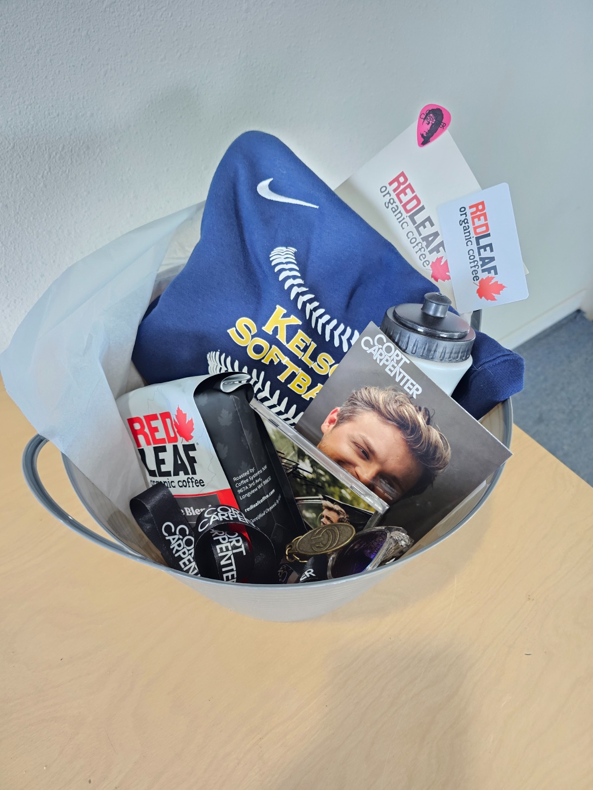 #9 HOMETOWN HITS - Red Leaf Gift Card, Red Leaf bag of Ground Coffee, Cort Carpenter Water bottle, Cort Carpenter Autographed CD, Cort Carpenter Lanyard and guitar pic, Youth Medium KGSA hooded Nike Sweatshirt