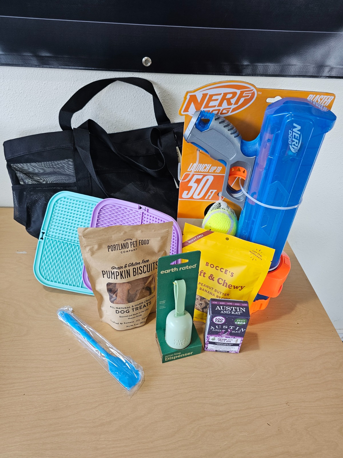#10 FETCH & GO - Nerf Gun ball launcher, Bocce Bakery Peanut Butter & Banana treats, Portland Pet Food Co Pumpkin Biscuits treats, Earth Rated poop bag holder with poop bags, 2 lick mats, Austin & Kat Extra strength CBD w/MCT oil ($70), travel water bowl (not pictured), Mesh tote bag (Total Value $140.00)