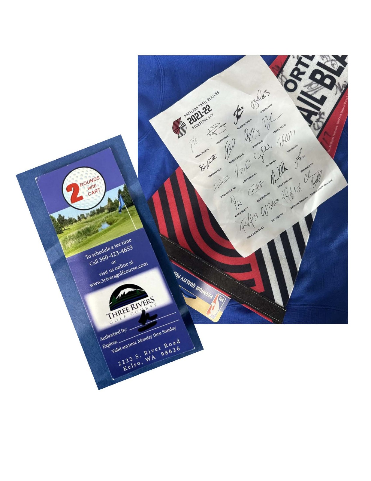 #14 SPORTS FAN - Three Rivers Golf Course certificate for 2 rounds of golf ($90.00), Signed Blazer Pennant (Total Value $190.00)